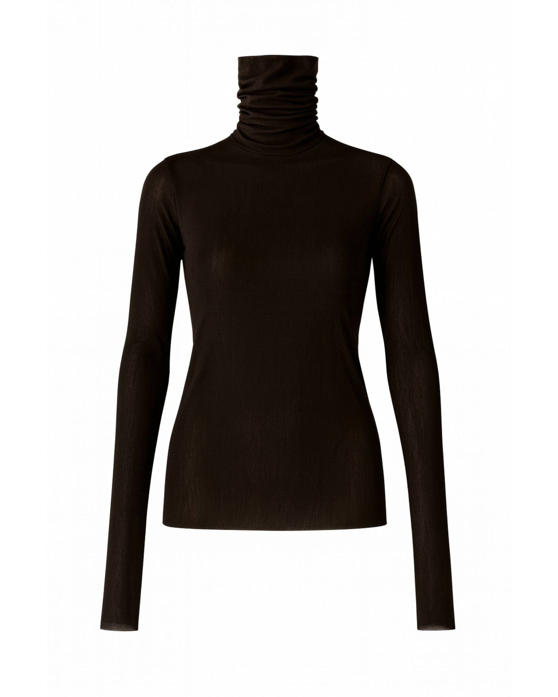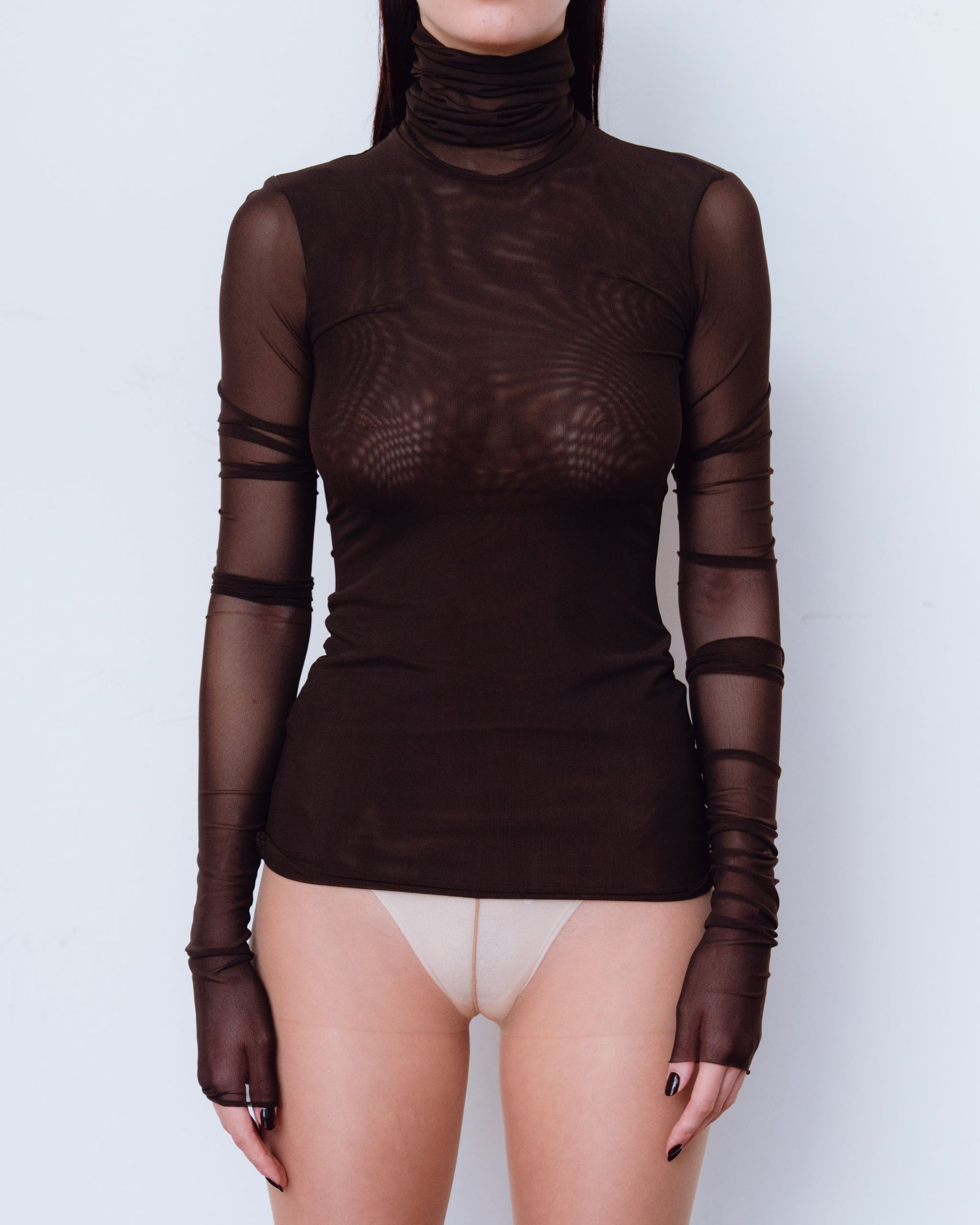 Top a maniche lunghe in tulle elasticizzato semitrasparente, con collo alto arricciato e pannello frontale doppiato per una copertura delicata del petto. Leggero, essenziale, pensato per muoversi con te, interamente realizzato in Italia.
